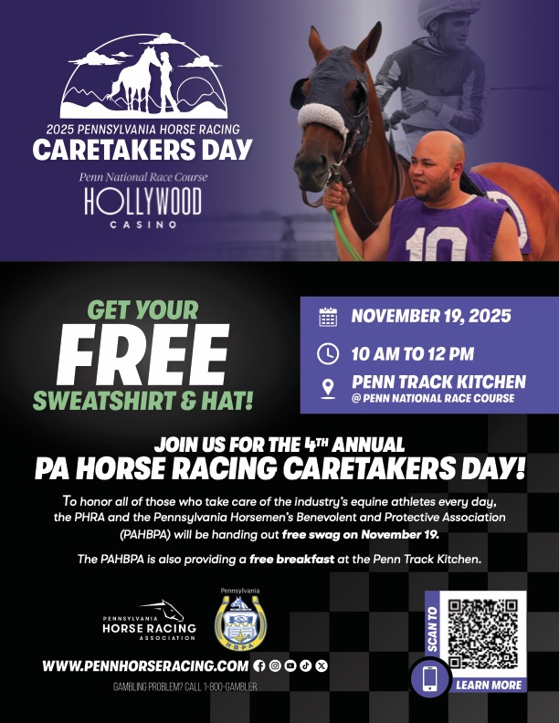 Join us for the 4th Annual Pennsylvania Horse Racing Caretakers Day on November 19, from 10:00 a.m. to 12:00 p.m. in the Penn Track Kitchen!