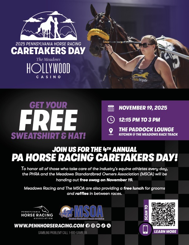 To honor all of those who take care of the industry’s equine athletes every day, the PHRA and the MSOA will be handing out FREE sweatshirts and hats to caretakers! While supplies last.