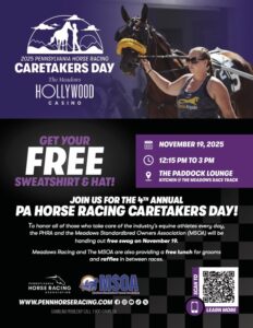 Join us for the 4th Annual Pennsylvania Horse Racing Caretakers Day on November 19, from 12:15 p.m. to 3:00 p.m. in The Paddock Lounge!