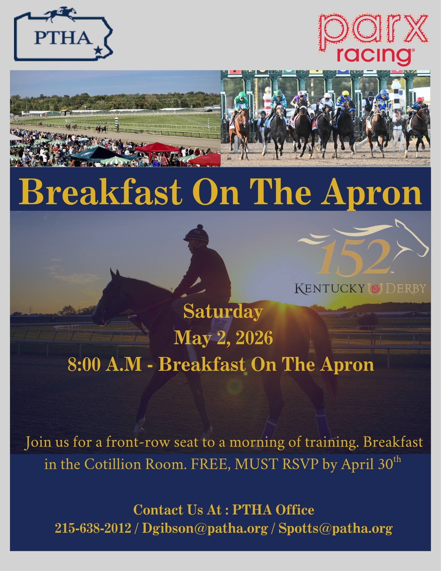 Join PTHA and Parx Racing for Breakfast on the Apron at 8AM on Saturday, May 2nd.